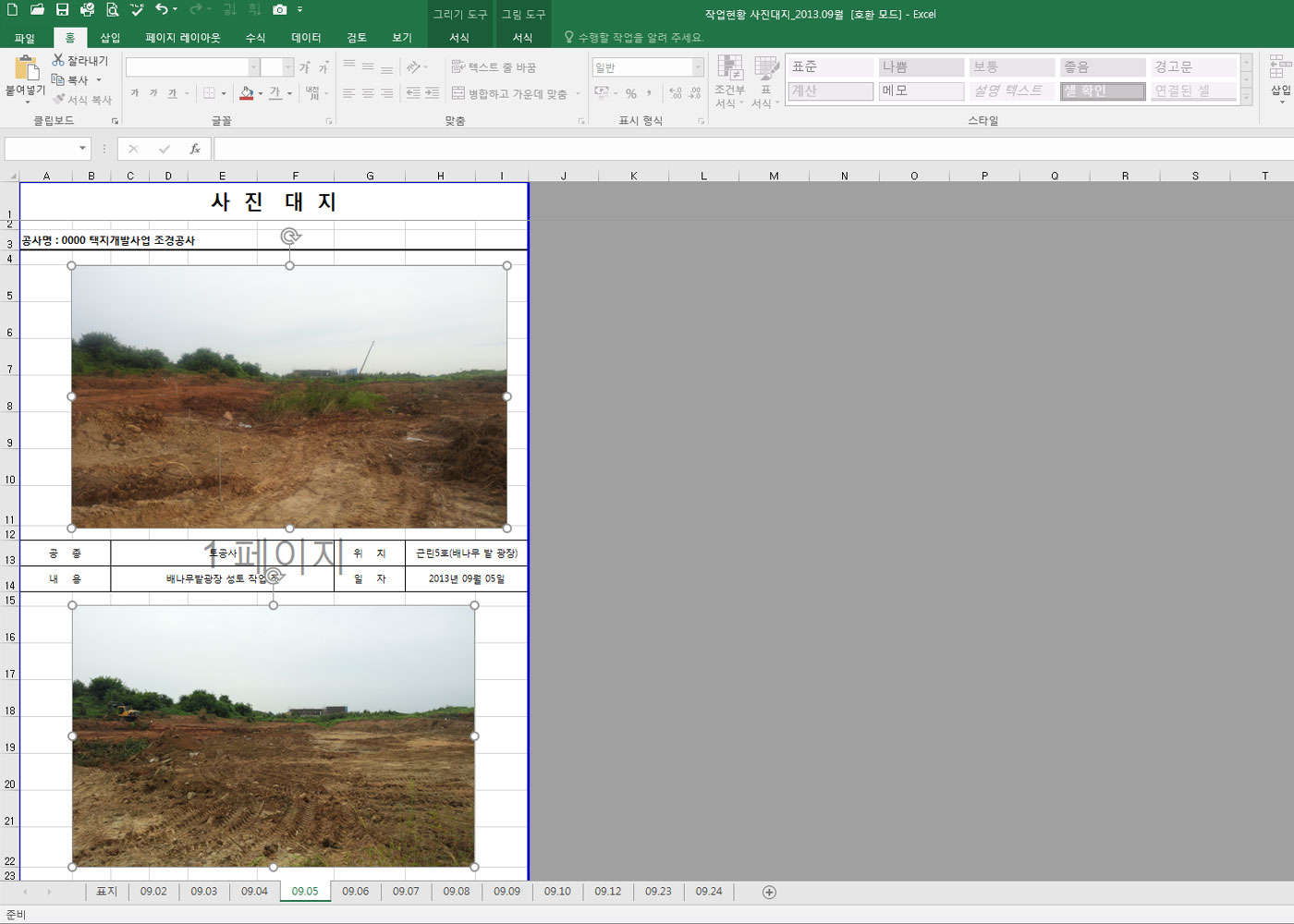 건설공사 서류 중 가장 많은 부분을 차지하는 것 중의 하나가 사진대지 일 것이다. 보통은 사진대지를 셀복사하거나 파일을 복사해서 작성하는 경우가 많다. 이때 기존의 본문에 있는 사진을 삭제하는 것은 매우 번거롭다. 오늘은 본문의 사진을 한꺼번에 선택하여 삭제하는 방법을 알아보자.